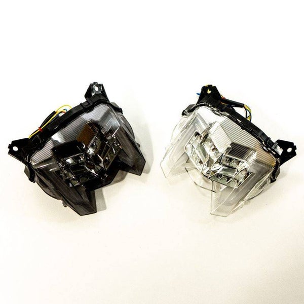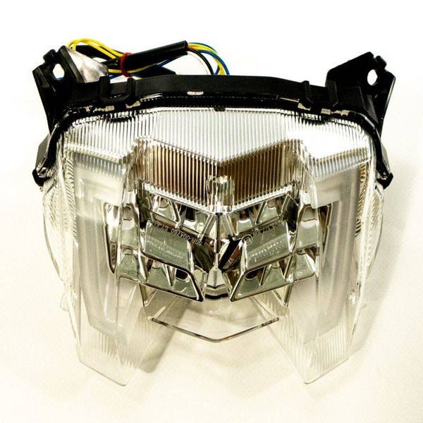Feux cristal avec clignos intégrés, éclairant en rouge avec une intensité variable lorsque le stop ou la veilleuse sont actionnés.