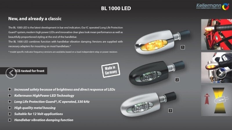Les clignotants BL 1000 LED de Kellermann sont une solution innovante dans le développement des clignotants à fixer à l'extémité du guidon. Les LED ainsi que Long Life Protection Guard® système fournissent un signal de lumière clignotant lumineux spectaculaire. Le nouveau modèle avec son verre claire, donne une ligne robuste à la fin du guidon. Le BL 1000 LED combine également la fonction d'indicateur de direction avec l’amortissement des vibrations du guidon.